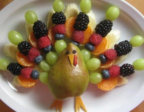 Для того чтобы сформировать туловище павлина, можно использовать грушу. Клюв и лапы сделайте из кожуры мандарина, а глаза из кусочков ежевики. Для хвоста используйте фруктовые шпажки. Нанизывать можно дольки мандарина, кружки банана, виноград, ежевику, чернику малину.